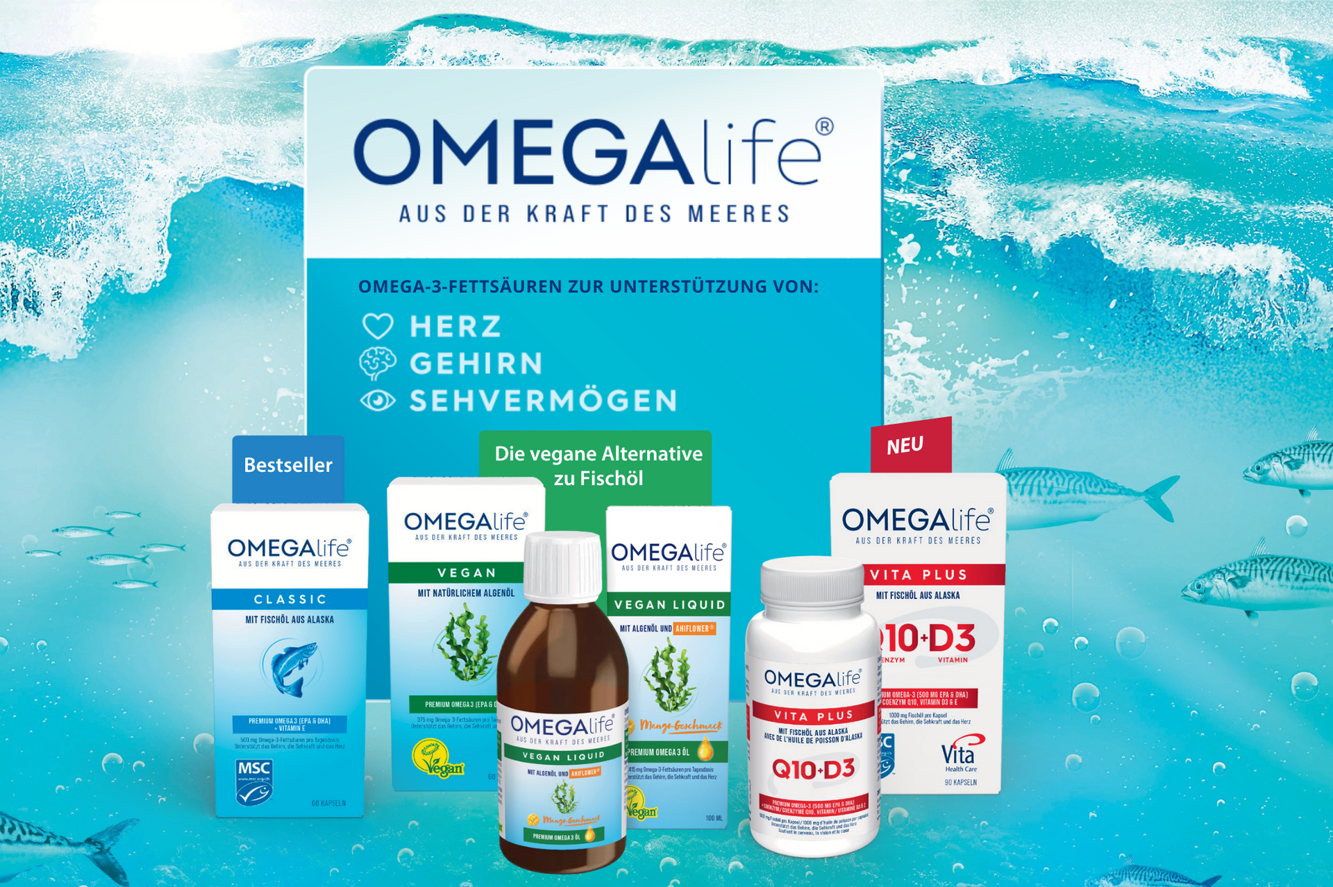 Ob zur Unterstützung von Herz, Gehirn oder Augen – OMEGA life® bietet für jedes Bedürfnis das passende Produkt: OMEGA life® Classic, OMEGA life® Vegan, OMEGA life® Algenöl Liquid und OMEGA life® Vita Plus.